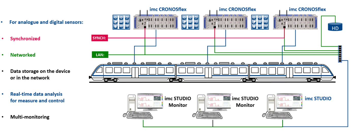 - imc CRONOSflex: A high-precision, modular DAQ system for large channel counts and demanding test programs. Ideal for certification, validation, and multi-car measurements, it supports EtherCAT networking, Power-over-Ethernet, and long-distance scalability.