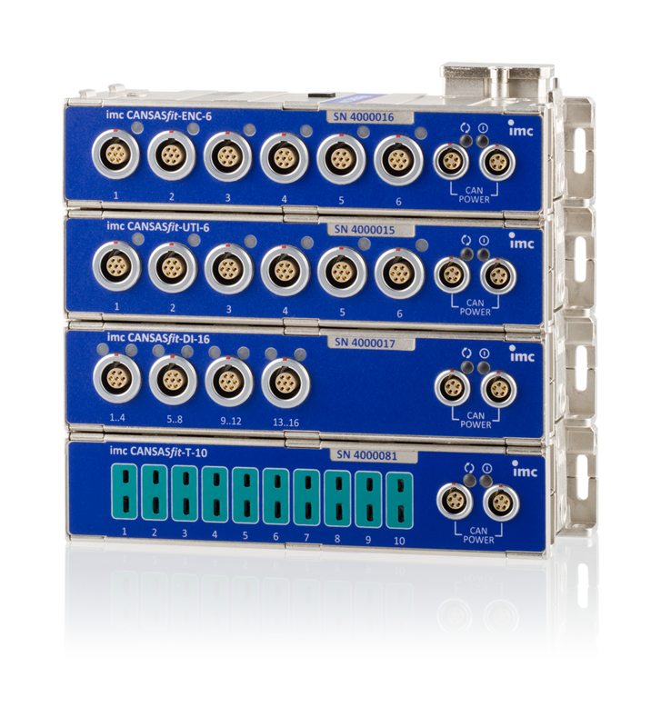Thanks to their broad input voltage range of 7-50 V DC, safe operation of the imc CANSASfit in different vehicle electrical systems is ensured. For everyday operations, the modules are especially comfortable: combined modules behave as a single unit – only the power supply and CAN bus need to be connected to the first module – all others are automatically connected via the click-mechanism. In addition, integrated LEDs inform the operator at a glance about supply fault, sensor breakage and module status.