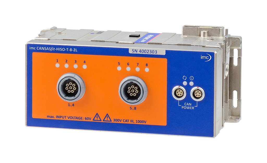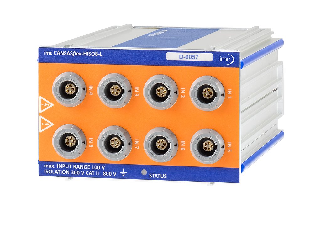 The CAN-Bus measurement module imc CANSASflex-HISO8-L allows safe and precise measurement of PT100/1000, respectively low voltages, as well as differential voltages up to 100V on high-voltage components with common mode voltage levels of up to 800 V. It is particularly suited for applications in the field of E-Mobility.
