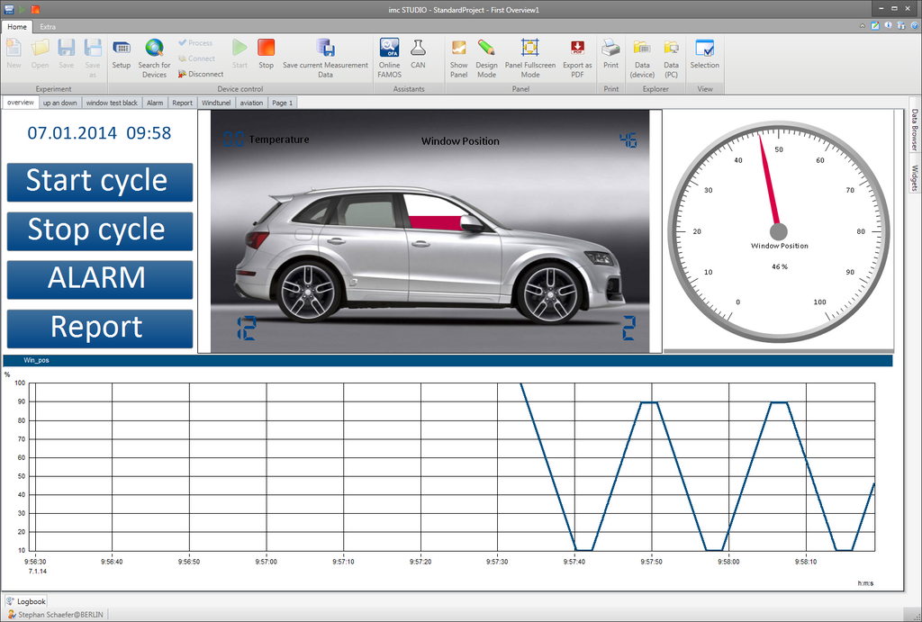 The Panel-pages created using imc STUDIO represent your personal operating and display interface for the connected measurement system. It is even possible to create large numbers and varieties of Panel-pages within a single project or single measurement configuration. The individual Panel-pages can be displayed on command either manually by means of tabs, or by means of control widgets. Furthermore, the system can be programmed to automatically display particular pages, for instance, governed by a trigger, or in response to a certain system status, or within an automation sequence by means of the imc STUDIO Sequencer.