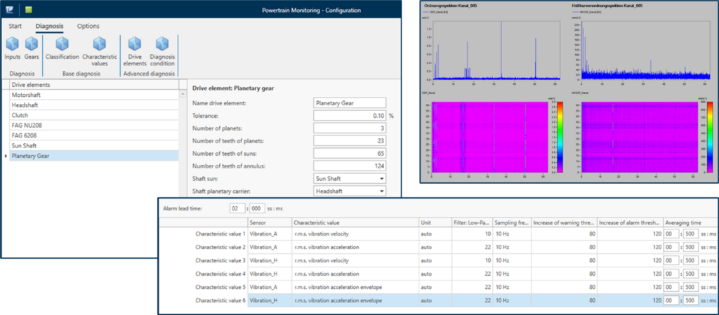 The Powertrain Monitoring add-on package enables developers and test engineers to monitor powertrains. Sophisticated vibration analyses make it possible to diagnose both gears and bearings. Based on a detailed kinematic model of the system, damage to bearings and gears can be identified at an early stage and, for example, individual ball bearing defects can be tracked down.