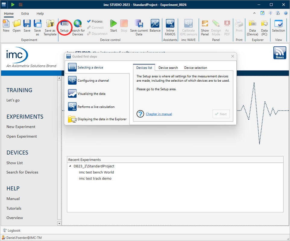 A guided tour helps new users to get started and explains the functions of the software step by step - starting with the selection of the device and the channel configuration up to the display of the measurement data. The wizard can be started and repeated at any time on the imc STUDIO homepage with a click on "Let's go".